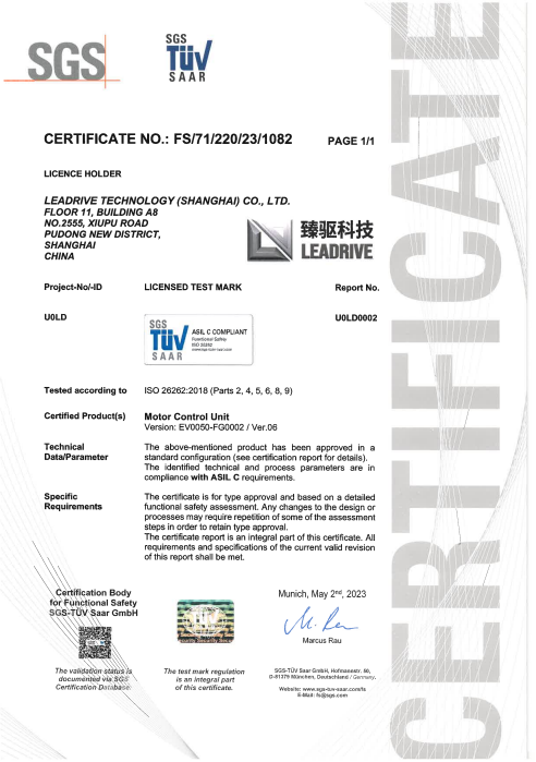 近日,國際權(quán)威第三方審核認(rèn)證機(jī)構(gòu)SGS為臻驅(qū)科技(上海)有限公司(以下簡稱“臻驅(qū)科技”)頒發(fā)ISO 26262:2018 ASIL C汽車功能安全產(chǎn)品認(rèn)證證書,該證書是臻驅(qū)科技獲得的首個(gè)功能安全產(chǎn)品認(rèn)證證書,也是繼2021年7月獲得“ISO 26262:2018 ASIL D汽車功能安全流程認(rèn)證證書”后,在汽車功能安全產(chǎn)品開發(fā)能力建設(shè)的又一重大里程碑。