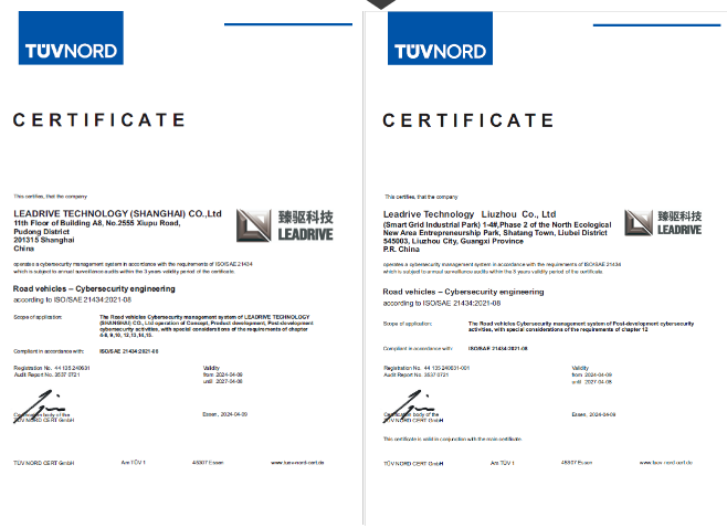 2024年5月11日,臻驅(qū)科技(上海)有限公司(以下簡稱“臻驅(qū)科技”)正式通過《ISO/SAE 21434道路車輛-網(wǎng)絡(luò)安全工程》(以下簡稱“ISO/SAE 21434”)汽車網(wǎng)絡(luò)安全管理體系認證,獲得此證書標志著臻驅(qū)科技已經(jīng)建立了完整的汽車網(wǎng)絡(luò)安全管理體系,具備了產(chǎn)品網(wǎng)絡(luò)安全開發(fā)和管理能力,是公司體系建設(shè)中又一關(guān)鍵里程碑。
